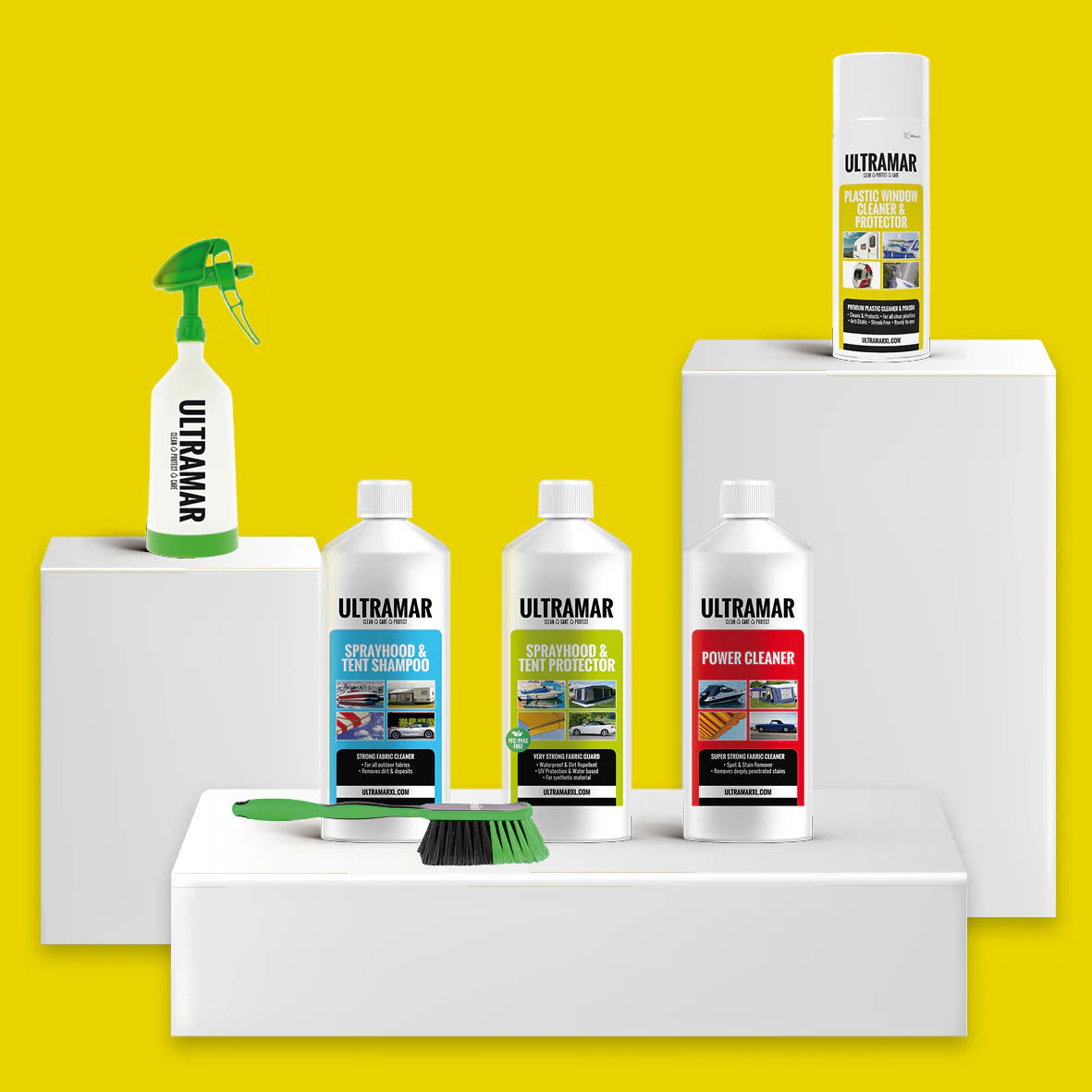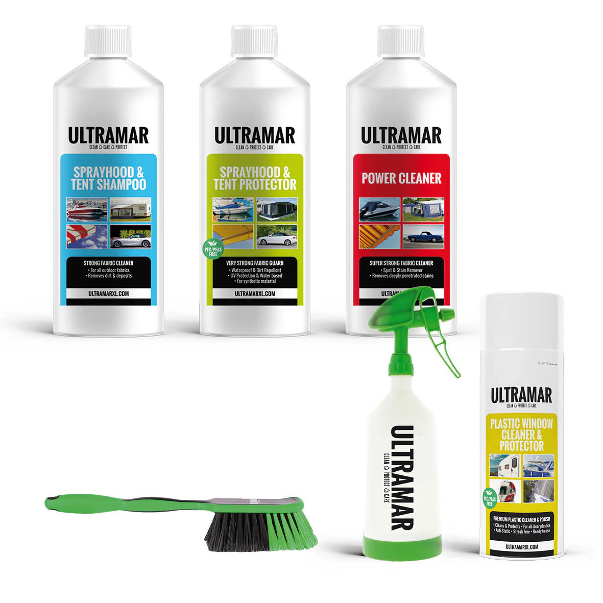 With this 1L - Complete Bundle you get everything at once to clean and impregnate your boat canopy, awning, convertible roof. This will keep the canvas perfectly clean and waterproof. Includes strong stain remover, extra soft brush, professional 1L spray and our bestseller for cleaning clear plastic windows.